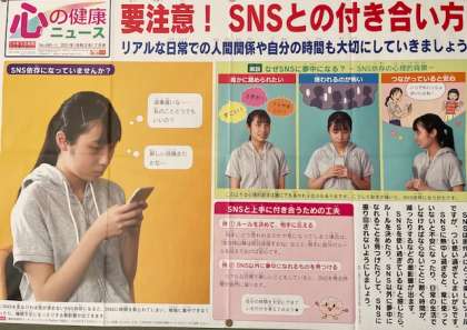 学校の掲示板には、SNSとの付き合い方が掲示されています。