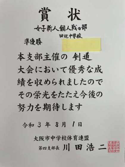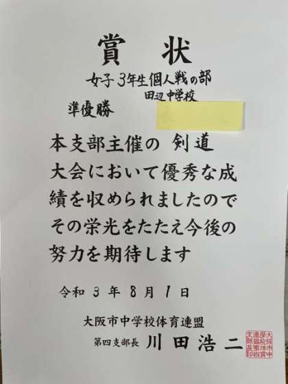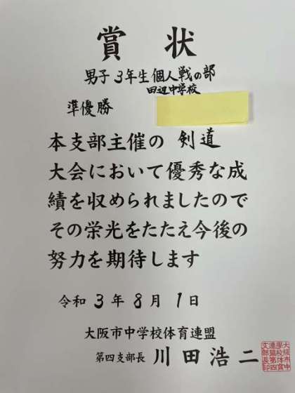 剣道部 ブロック大会  準優勝   8月1日(日)