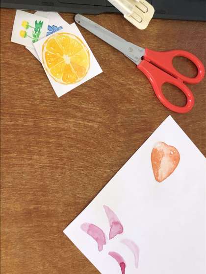 水彩絵具を使いこなして果物やお花を見事に描いていますね!