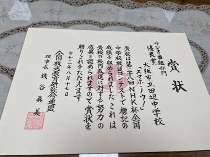 放送部の全国中学校放送コンテスト「優良賞」の表彰を行いました。