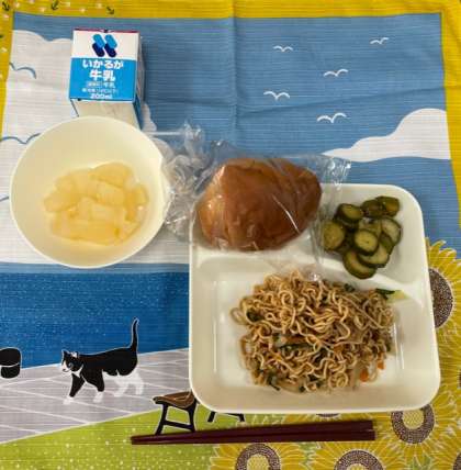 今日の献立は、「1/2黒糖パン、牛乳、オイスターソース焼きそば、きゅうりの中華あえ、和なし(缶詰)」でした。