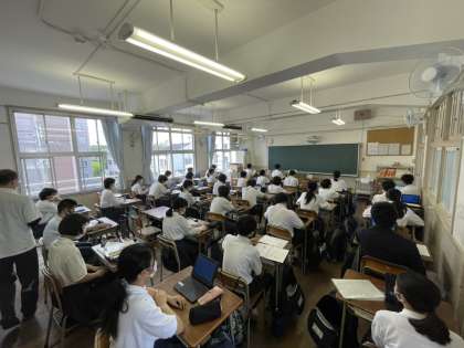 みんなで一斉に集まることもできない現状ですが、各教室で姿勢を正して、静かに校長先生の話を聞いていました。
