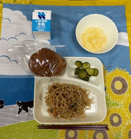 今日の献立は、「1/2黒糖パン、牛乳、焼きそば、きゅうりのしょうがづけ、洋なし(カット缶)」でした。