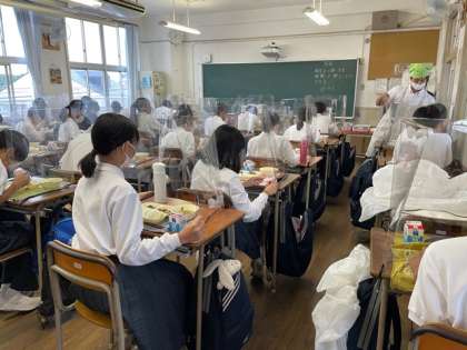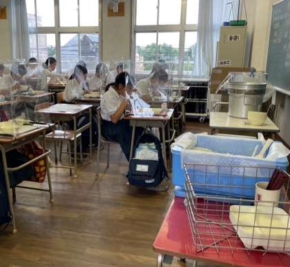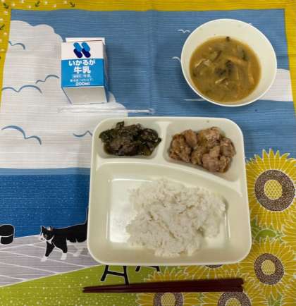今日の献立は、「ごはん、牛乳、焼きとり、みそ汁、なすのそぼろいため」でした。