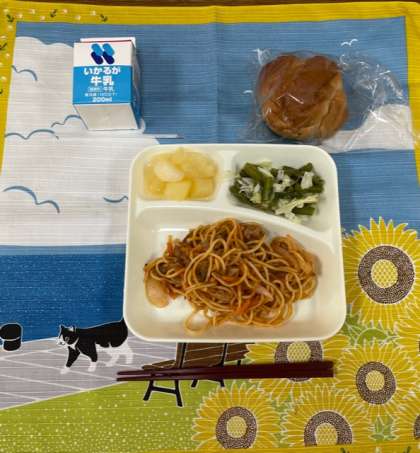 今日の献立は、「1/2黒糖パン、牛乳、イタリアンスパゲッティ、グリーンアスパラガスとキャベツのサラダ、洋なし(カット缶)」でした。