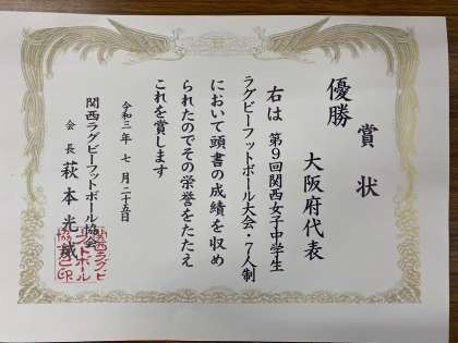 関西女子中学生ラグビーフットボール大会に大阪府代表として出場し、みごと優勝しました。