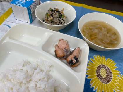 今日の献立は、「ごはん、牛乳、さけのしょうゆ風味焼き、五目汁、高野豆腐のいり煮」でした。