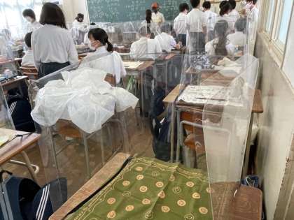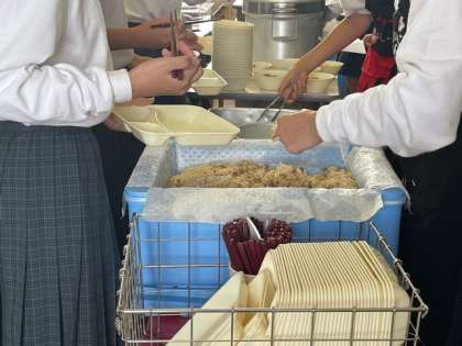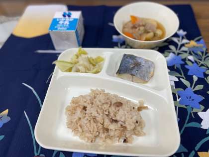 今日の献立は、「ごはん、牛乳、さごしの塩焼き、豚肉とじゃがいもの煮もの、キャベツの梅風味」でした。