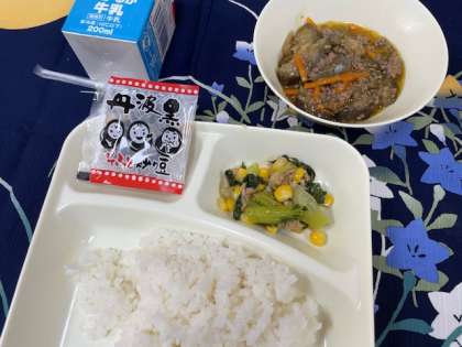 今日の献立は、「ごはん、牛乳、マーボーなす、ツナとチンゲンサイのいためもの、いり黒豆」でした。