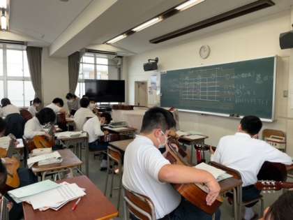 音楽の授業では、ギターで喜びの歌を練習しています。