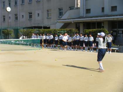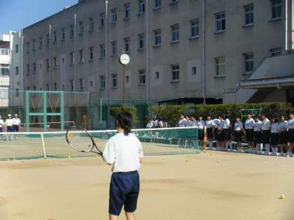 女子テニス部は先輩のプレーを見学してイメージトレーニングをしています。