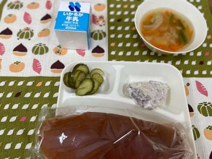 今日の献立は、「黒糖パン、牛乳、かつおのマリネ焼き(ノンエッグドレッシング)、鶏肉とじゃがいものスープ、きゅうりのサラダ」でした。