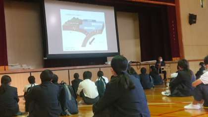 講義では地震の起こるメカニズムを知り、地震が起きた時に取るべき行動を、実際に地震や津波が起きた時の映像を見ながら学習しました。