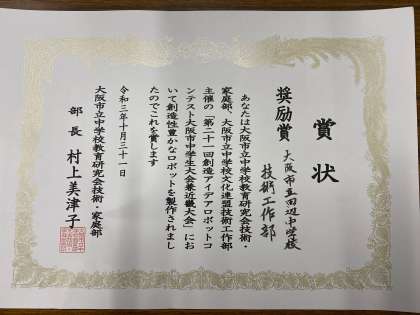 技術工作部では、「創造アイデアロボットコンテスト」の大阪市大会兼近畿大会で奨励賞を受賞しています。