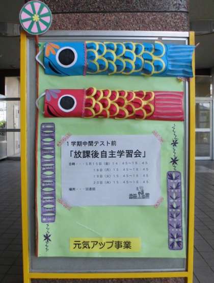 学校元気アップ「放課後自主学習会」の知らせを玄関にも設置しました。中間テストに向け、「放課後自主学習会」を積極的に活用してください。