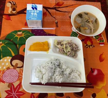 今日の献立は、「菜飯、牛乳、豚肉とまいたけのいためもの、いわしのつみれ汁、かぼちゃういろう」でした。