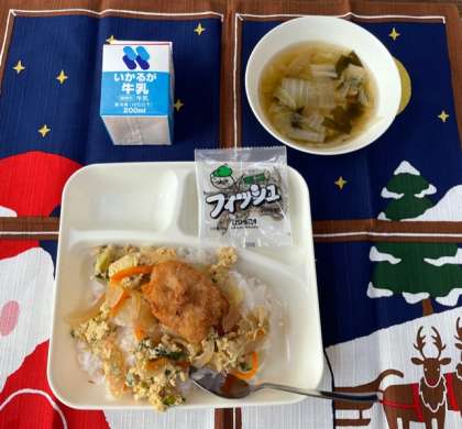 今日の献立は、「カツ丼、牛乳、すまし汁、ミニフィッシュ」でした。 今日もおいしくいただきました。