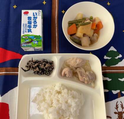 今日の献立は、「ごはん、牛乳、鶏肉のゆず塩焼き、含め煮、魚ひじきそぼろ」でした。