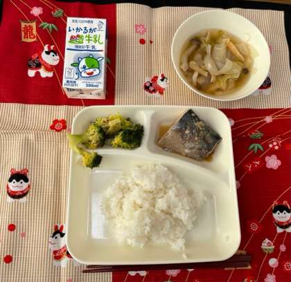 今日の献立は、「ごはん、牛乳、さばのみそ煮、五目汁、ブロッコリーのごまあえ」でした。