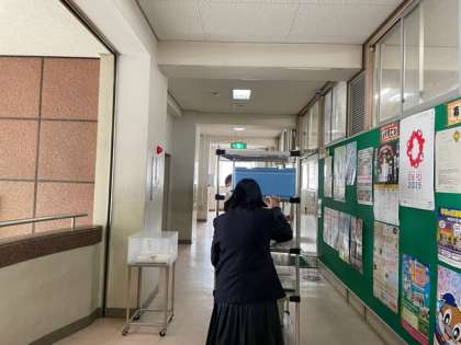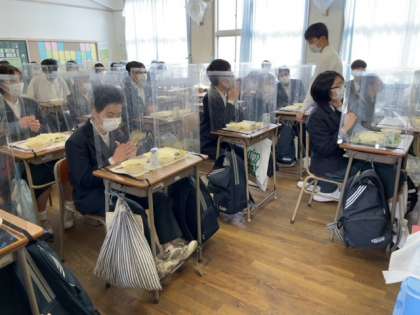 PTAから寄贈の「感染防止パーテーション」を活用して、感染防止に努めながら給食を食べています。