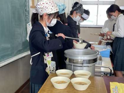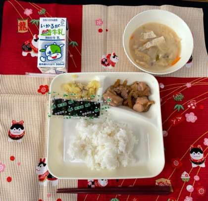 今日の献立は、「ごはん、牛乳、鶏肉の甘辛焼き、かす汁、くりきんとん、焼きのり」でした。
