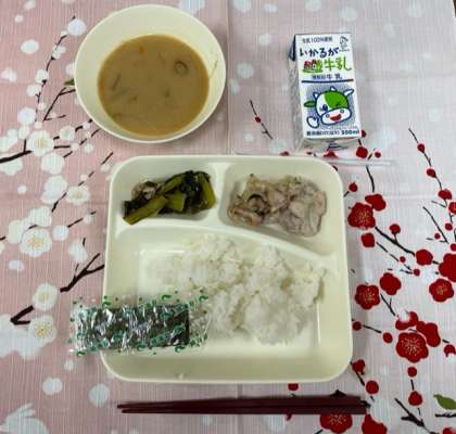 今日の献立は、「ごはん、牛乳、鶏肉のゆず塩焼き、みそ汁、こまつなの煮びたし、焼きのり」でした。
