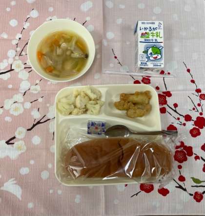 今日の献立は、「黒糖パン、牛乳、白身魚フリッター、洋風煮、カリフラワーのサラダ、固形チーズ」でした。