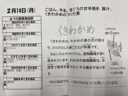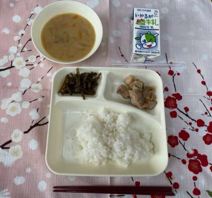 今日の献立は、「ごはん、牛乳、まぐろの甘辛焼き、豚汁、くきわかめのつくだ煮」でした。