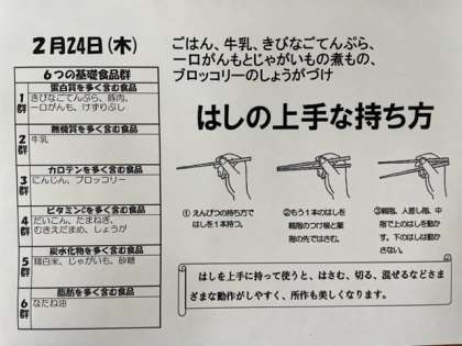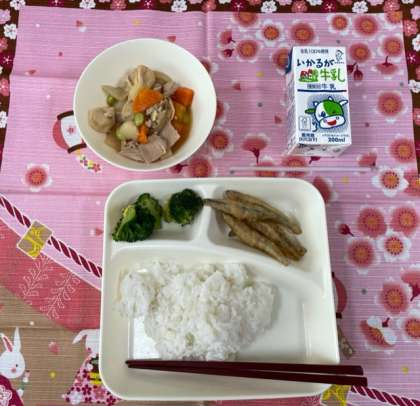 今日の献立は、「ごはん、牛乳、きびなごてんぷら、一口がんもとじゃがいもの煮もの、      ブロッコリーのしょうがづけ」でした。