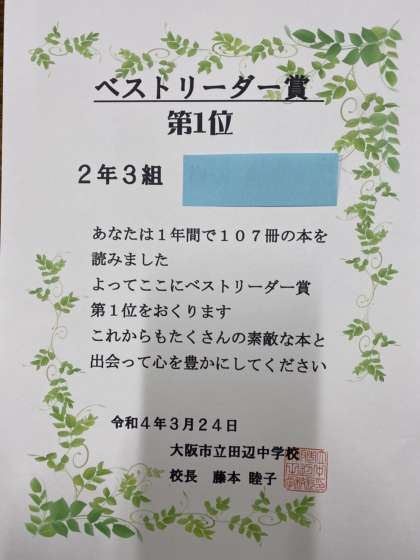 図書館の本の貸し出し冊数の一番多い人と二番目の人に表彰がありました。