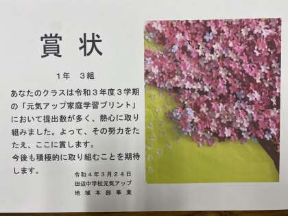 元気アップ家庭学習プリントの提出数の多い学級に表彰がありました。