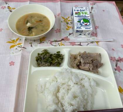 今日の献立は、「ごはん、牛乳、豚肉のしょうが焼き、みそ汁、じゃこピーマン」でした。