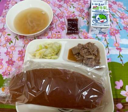 今日の献立は、「コッペパン、牛乳、豚肉のデミグラスソース、スープ、キャベツとコーンのソテー、いちごジャム」です。