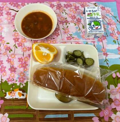 今日の献立は、「パンプキンパン、牛乳、ビーフシチュー、きゅうりのサラダ、あまなつかん」でした。