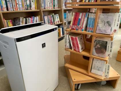昼休みの図書室では、返却、貸出しで多くの人がきています。