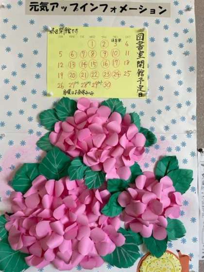 元気アップコーディネーターさんが、季節を感じさせる紫陽花の花とともに開館日のお知らせを掲示してくださっています。いつもありがとうございます。