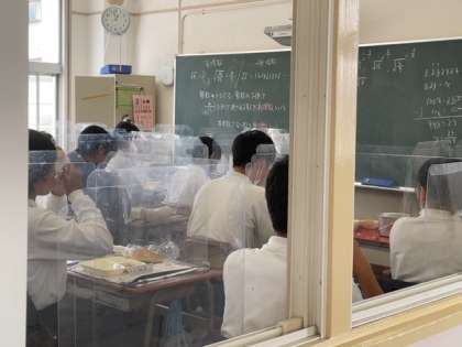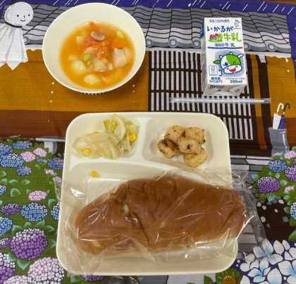 今日の献立は、「おさつパン、牛乳、いかてんぷら、フレッシュトマトのスープ煮、サワーソテー」です。