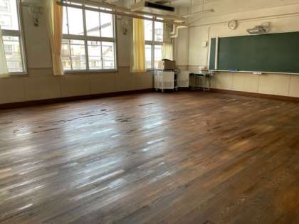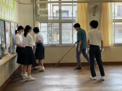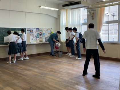 机を出して、掃き掃除をして、美化委員さんと担任の先生で油引きを行いました。