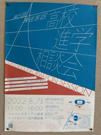 第5回東住吉区高校進学相談会が、8月7日(日)にヤンマースタジオ長居のホール&メイン室内練習場で行われます。