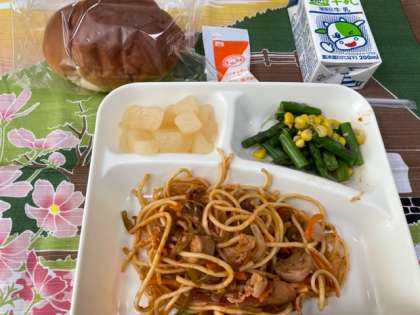 今日の献立は、「1/2黒糖パン、牛乳、イタリアンスパゲティ、グリーンアスパラガスのサラダ、和なし」でした。