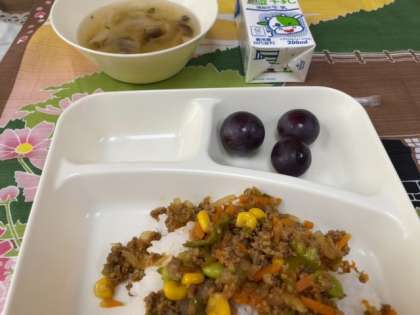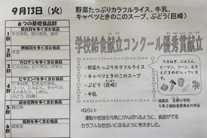 今日の献立は、「学校給食献立コンクール優秀献立」で、野菜たっぷりのカラフルらいす、牛乳、キャベツときのこのスープ、ぶどう(巨峰)でした。