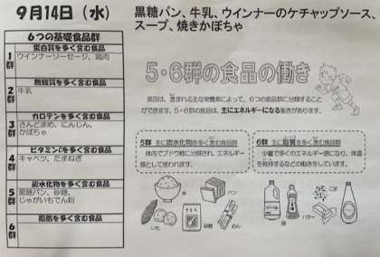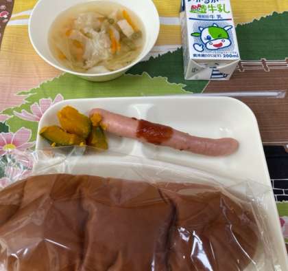 今日の献立は、「黒糖パン、牛乳、ウインナーのケチャップソース、スープ、焼きかぼちゃ」でした。