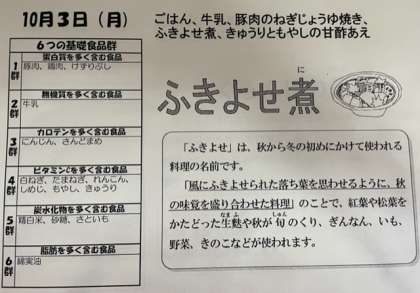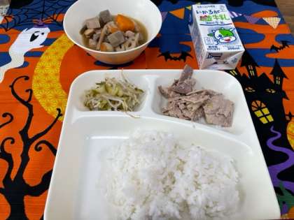今日の献立は、「ごはん、牛乳、豚肉のねぎじょうゆ焼き、ふきよせ煮、きゅうりともやしの甘酢あえ」でした。