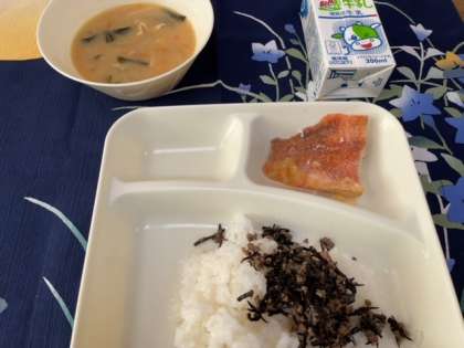 今日の献立は、「ごはん、牛乳、あかうおのみぞれかけ、みそ汁、牛ひじきそぼろ」でした。