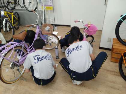 リサイクルショップからの自転車を清掃しています。自転車のしくみなど色々と教えていただいきました。
