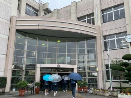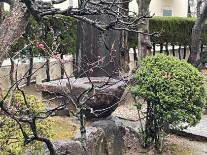「協力一致」の石碑の近くの梅の花のつぼみがほころび始めました。