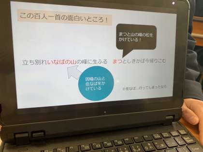 国語の授業での「百人一首の勝負札(もしくは推し札)をグループスピーチしよう」の様子です。