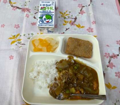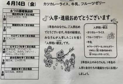 本校の給食は、やたなか小中一貫校で調理していただき、給食運搬員さん、配膳員さんによって提供されています。