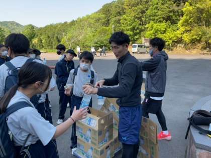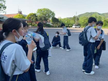 帰ってきた班からスポーツドリンクを飲んで、水分補給をしています。