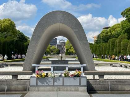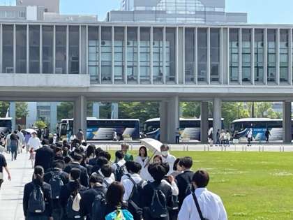 説明を聞いたり、写真を撮ったりしながら広島平和記念資料館に向かっています。